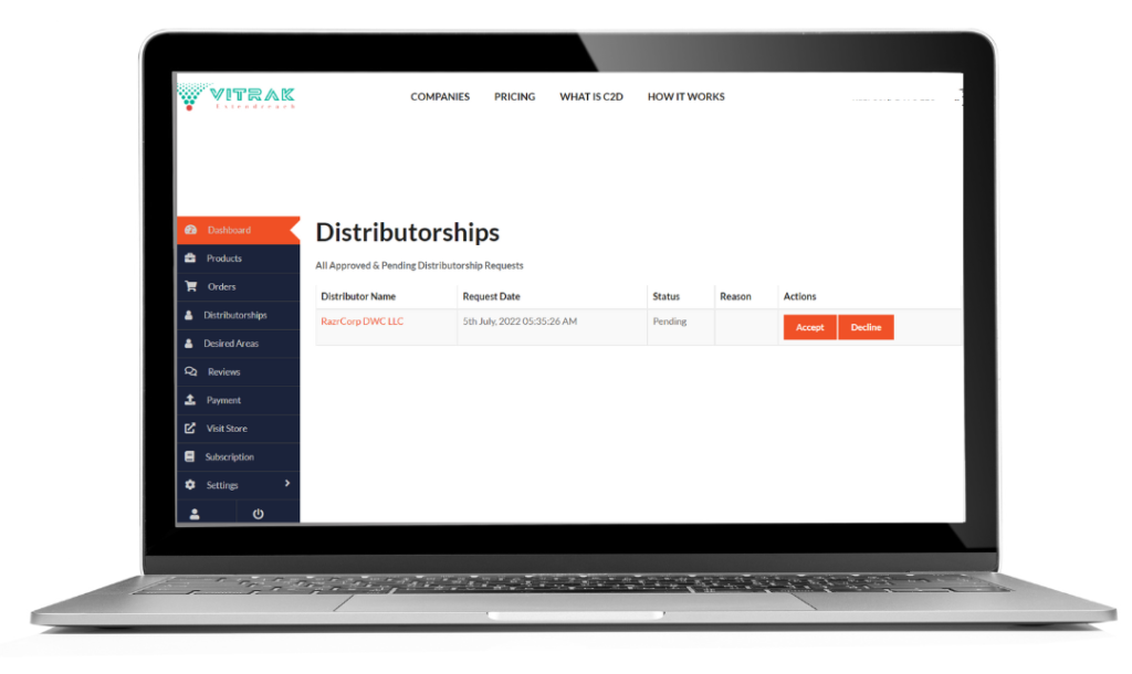 4. You will receive requests from distributors asking for distributorship. You can check their details on the website before responding. You can accept or reject the request depending if the distributor meets your requirements. To accept/reject, visit Dashboard→Distributorships.